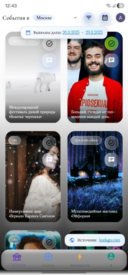 Просматривай мероприятия, сохраняй понравившиеся и формируй собственный список того, что хочешь посетить.